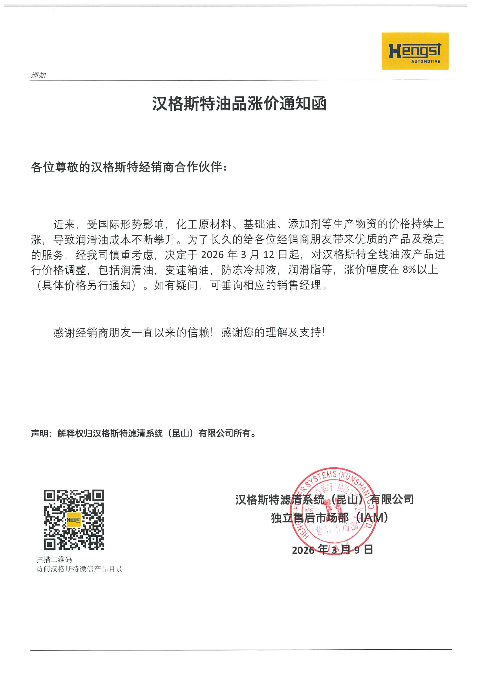 Hengst Oil Products Price Adjustment Notice