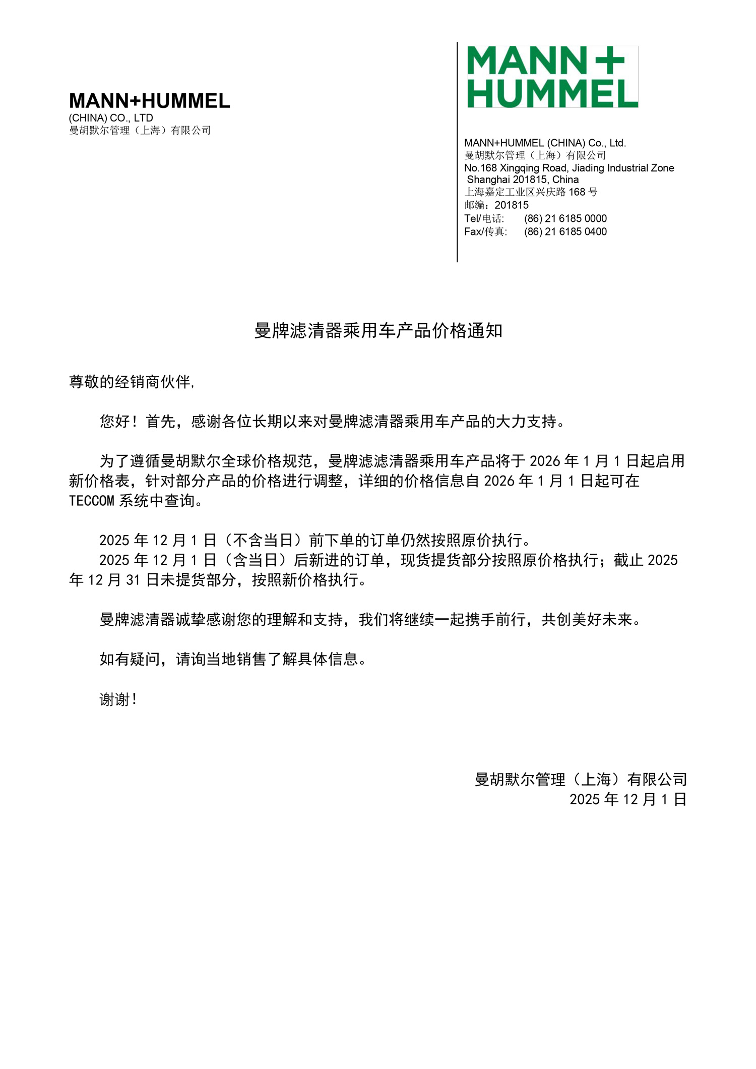 MANN FILTER 2026 Passenger Car Product Price Notification