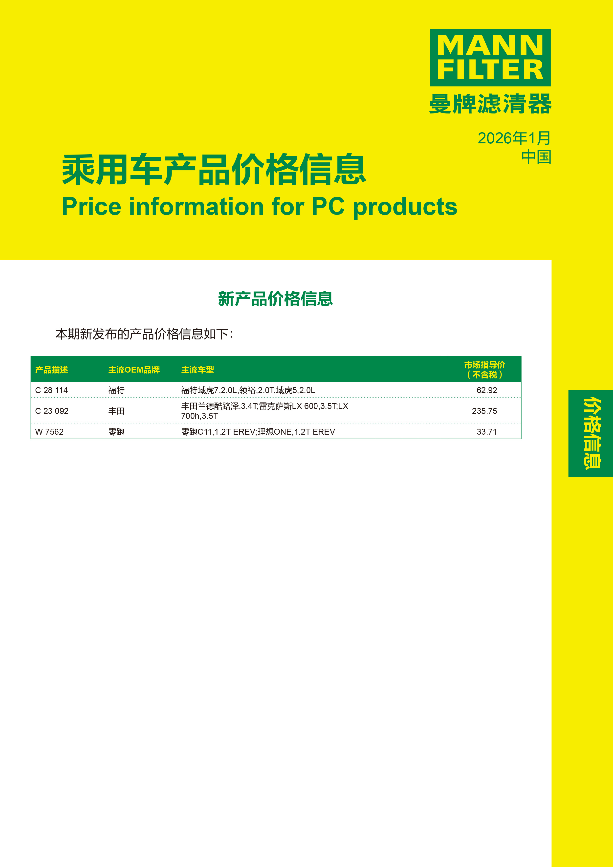 January 2026 Mann Product Pricing Information Notice