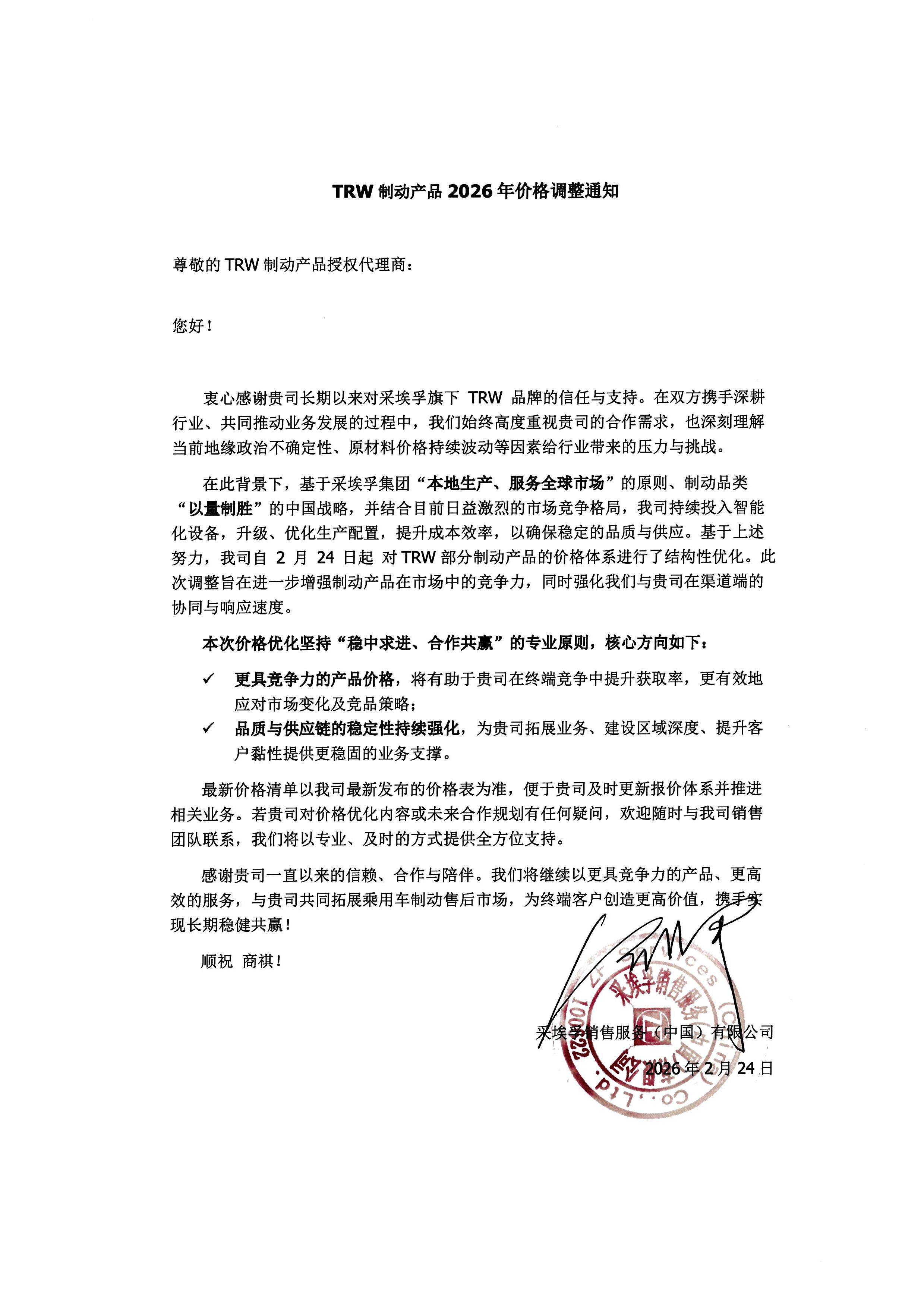 TRW Brake Products 2026 Price Adjustment Notice Letter