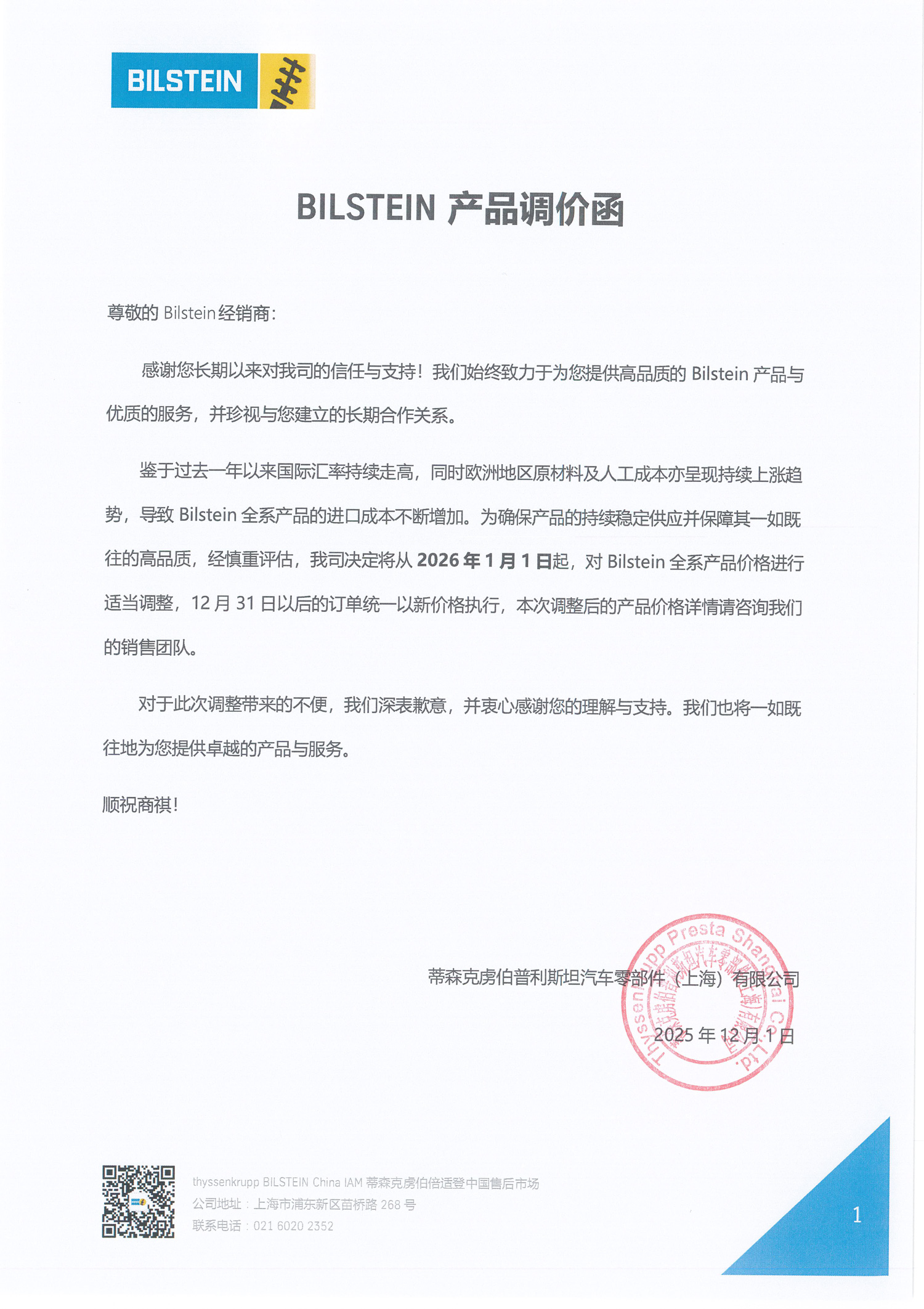 2026年倍适登产品调价通知