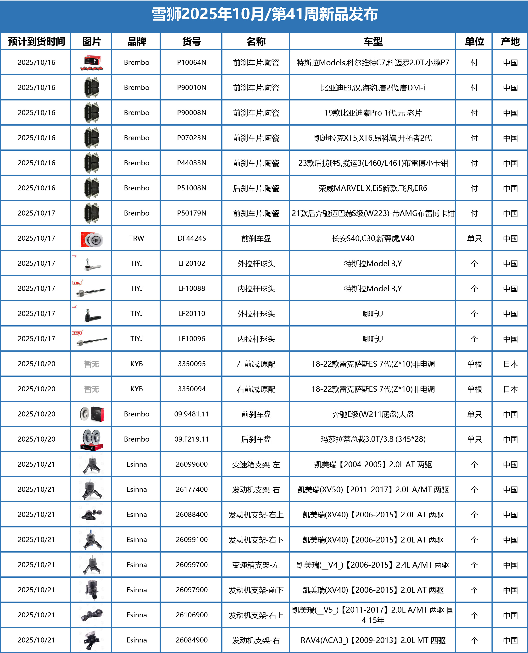 雪狮2025年10月/第41周到货新产品信息