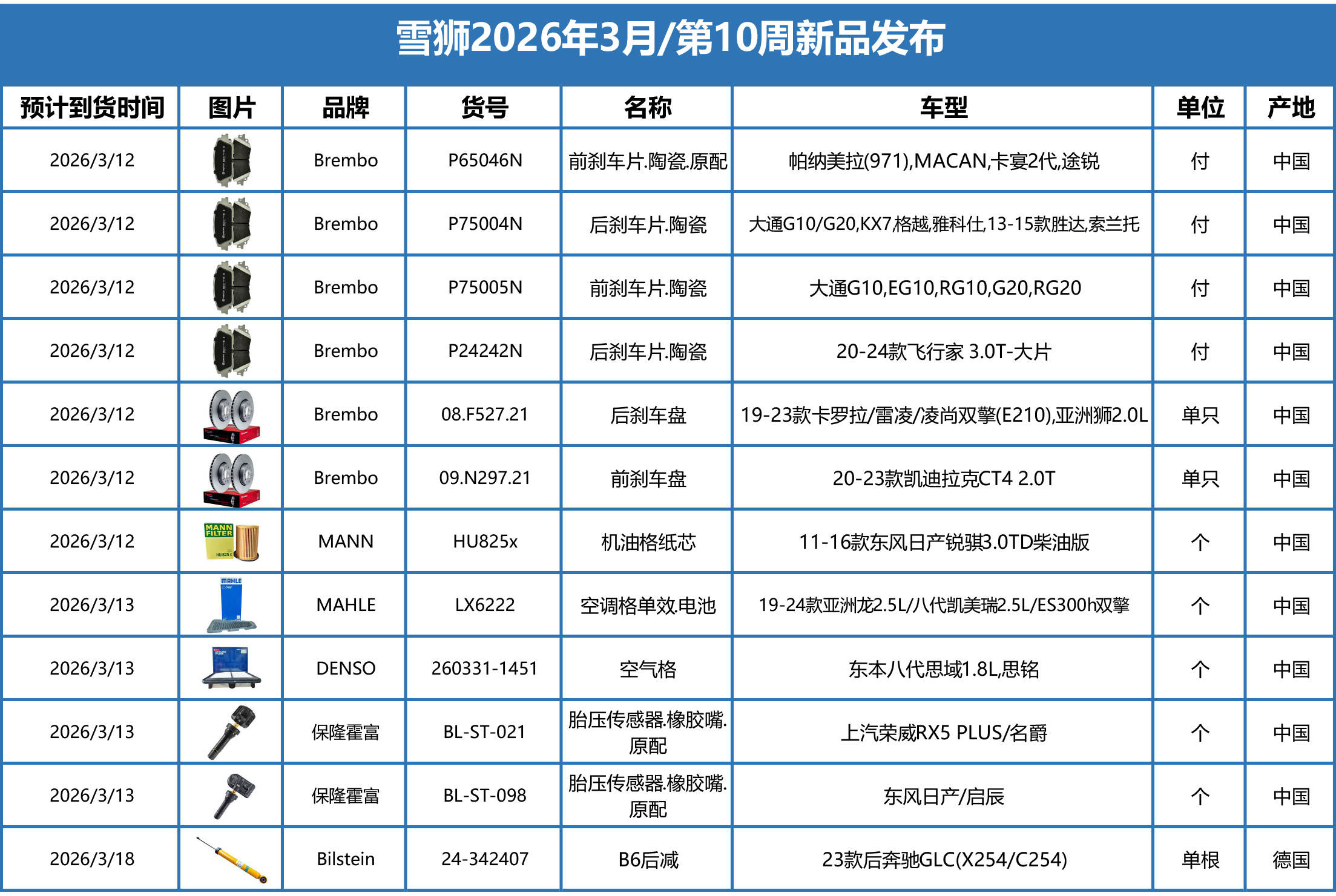 雪狮2026年3月/第10周到货新产品信息