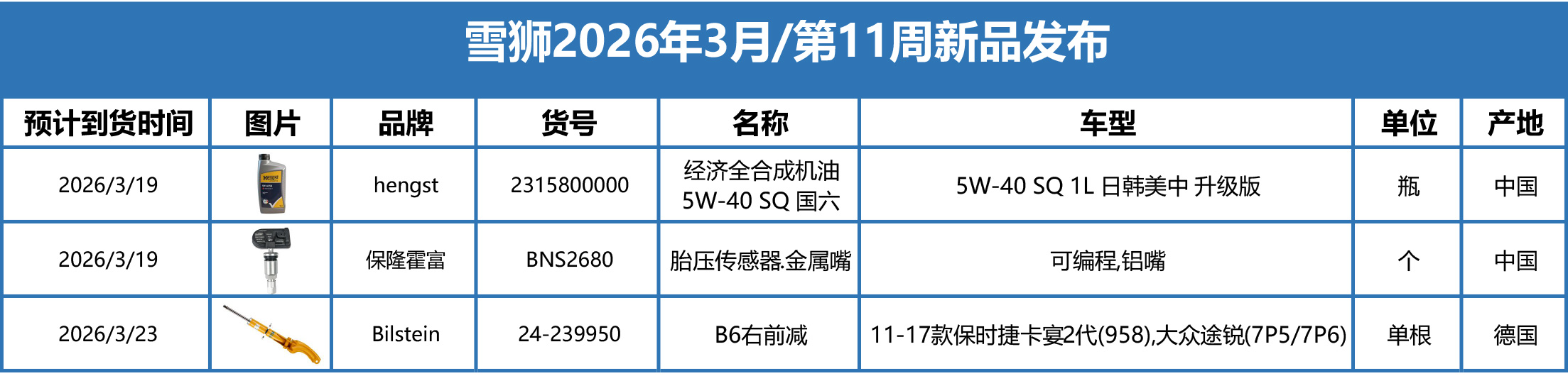 雪狮2026年3月/第11周到货新产品信息